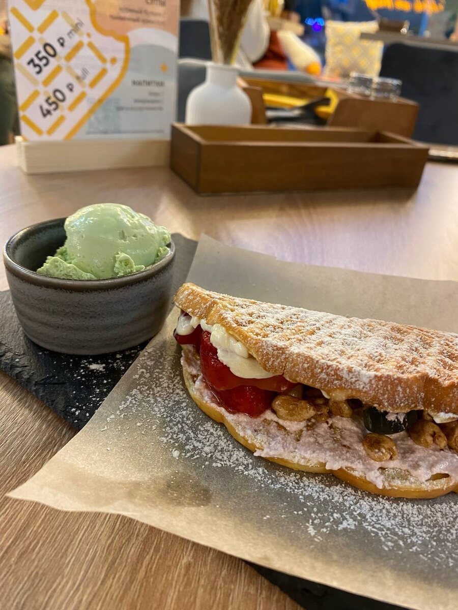 Кто сказал, что вафли – это блюдо для завтрака? Вафли прекрасно могут порадовать и на обед, и на ужин. В Калининграде есть сеть, которая специализируется на этом блюде. Голодными вы не останетесь, потому что это очень сытно. В сладкой вафле было много начинки. Настолько много, что она выскальзывала на тарелку и пыталась покинуть стол. Единственный минус – цена. На эти же деньги можно в столовой рядом взять суп и два салата. Но кто нам запретит иногда себя радовать? Что там в Калининграде в MAX