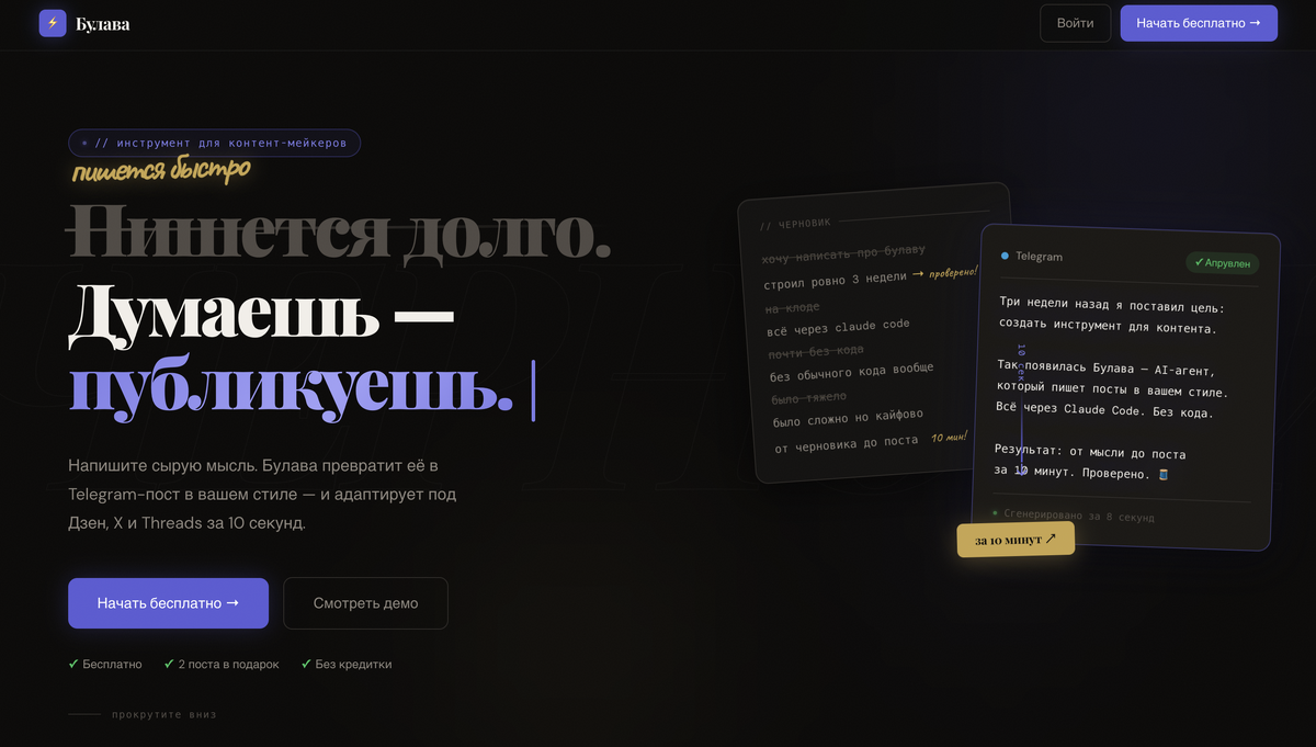 Все мои продукты выглядят одинаково. Я очень устал от этого — и в этот раз решил сделать нормально с самого начала. Оказалось, это ой как не просто. Рассказываю как шел, где облажался и что в итоге помогло. Когда запускаешь продукт через вайбкодинг, интерфейс генерируется быстро. Проблема в том, что он выглядит одинаково у всех. Серые карточки, скругленные кнопки, один и тот же шрифт. Любой кто работал с Claude Code, v0 или Bolt — знает этот вид. Я строю Булаву — инструмент для вайбкодинга контента. Ты закидываешь черновик, агент превращает его в пост для TG, адаптирует под Дзен, X, Threads. MVP уже работает в терминале. Следующий шаг — веб-приложение для людей без IDE. И вот тут встал вопрос дизайна. Решил подойти серьезно. Потратил 2 часа на подготовку: Казалось бы: всё готово, можно запускать. Запустил. Открыл в браузере. Захотелось поплакать, сильно так Классическая ИИ-поделка. Даже с выбранной дизайн-системой и настроенными скилами. Красиво технически — но абсолютно безликое. Я