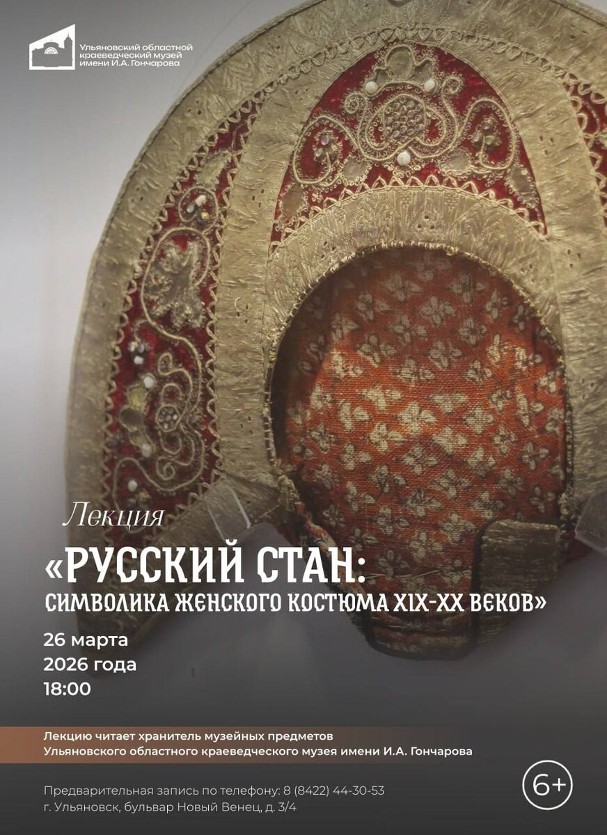 + 🗓️ 26 марта в 18:00 📍Ульяновский областной краеведческий музей имени И.А. Гончарова, бульвар Новый Венец, д. 3/4 Костюм в русской традиционной культуре — не просто одежда. Это сложный текст, где каждая деталь, цвет и линия узора были наполнены глубоким смыслом. Вместе с лектором слушатели попробуют «прочесть» эту забытую летопись, обращаясь к истокам общерусской идентичности в многонациональной палитре Поволжья на основе богатой фондовой коллекции Ульяновского областного краеведческого музея. Проводником в мир скрытых смыслов станет хранитель музея — человек, который знает каждый стежок, каждую потускневшую нить в музейной коллекции и может рассказать историю, стоящую за узором. Перед лекцией слушателей ждет погружение в материал: они смогут вживую увидеть то, о чем пойдет речь, на одноименной выставке, где будут представлены элементы русского женского национального костюма XIX-XX вв.: головные уборы — от богато украшенных позументом, золотным шитьем и камнями кокошников до скр