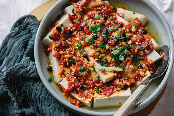 Он приносит сразу несколько вещей. Во-первых, остроту — да. Во-вторых, соль и глубину, которые появляются именно у ферментированного перца, а не у свежего. В-третьих, ту особую мягкую кислотность и зрелость вкуса, из-за которой соус ощущается не как грубая перечная масса, а как вещь собранная и уже прожившая свою ферментацию. Именно поэтому такой соус особенно хорош для тофу на пару: он не просто остается сверху, а постепенно проходит вниз и отдает вкус мягкой основе. В хунаньской кухне это особенно заметно: ферментированный чили там часто строит блюдо не силой, а направлением вкуса.