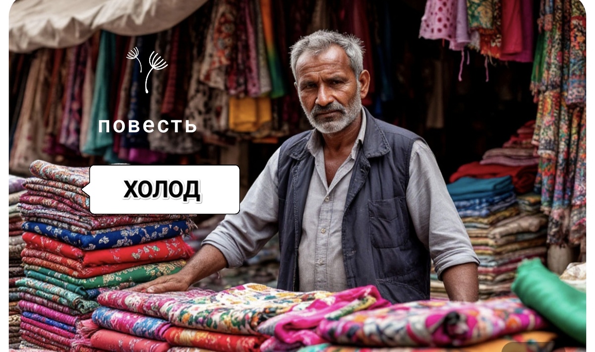 —Женщина, — обратился к ней Гарик — Вы определились? Если сомневаетесь, возьмите этот, в цветочек. Он и для фартука хорош, и на занавески пойдёт. Прочный, ивановский.