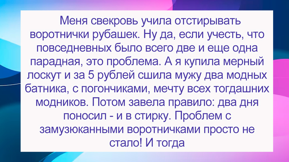 И что же руки то у тебя такие кривые? Дай хоть приеду, да научу тебя премудростям, как семью в порядке держать!" Есть старая еврейская притча, как пчела укусила медведя в нос. Он по носу лапой бряк - пчёлка еле успела увернуться. Села на цветок и корит его: "Что ж ты, медведь, злой такой? Я ведь тебя мёдом кормлю!" А тот лапой нос зажал и говорит: "Знаешь что? Не надо мне от тебя ни мёду, ни яду". Меня свекровь учила отстирывать воротнички рубашек. Ну да, если учесть, что повседневных было всего две и еще одна парадная, это проблема. А я купила мерный лоскут и за 5 рублей сшила мужу два модных батника, с погончиками, мечту всех тогдашних модников. Потом завела правило: два дня поносил - и в стирку. Проблем с замузюканными воротничками просто не стало! Готовила я, как муж утверждал, лучше его мамули, порядок навести, если не сильно набрасывать - вообще не вопрос. Вроде, меня и учить-то нечему. И это свекрыску очень нервировало. Видимо, она вымечтала себе послушную невестушку-доченьку, н