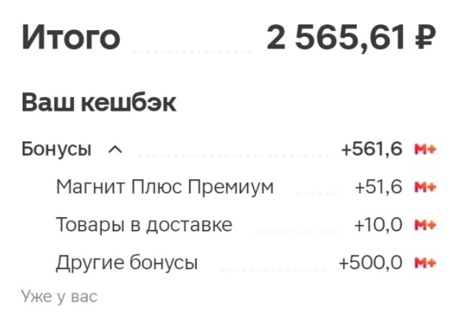 Рассказываю схему образования таких цен. В игре Магнита выпали купоны по которым возвращался кэш 500 бонусов (равно рублей). Мне досталось несколько таких купонов. В разное время сделала два заказа. Первый заказ здесь. Про второй заказ, если правильно помню, сообщала здесь. В этом заказе тоже были только обычные продукты, однако с применением купона на 500 рублей получилось очень интересное количество бонусов! Не 500, а целую тысячу насыпали! За что - не знаю, возможно какие-то продукты считались с повышенными бонусами. Я всегда (почти) стараюсь нажимать на все активности в приложении Магнита, чтобы если что, бонусы засчитались автоматом, так как сидеть каждый раз в приложении в поисках дополнительных плюшек утомительно. А так, раз в неделю пощелкал и вот такой сюрприз получаешь в виде дополнительных, по сути 500 рублей. Выписка из моего приложения на второй заказ. С этого заказа Магнит вернул мне 300 рублей - часть бананов привезли зелеными. Вернули всю стоимость бананов. Они вот тол