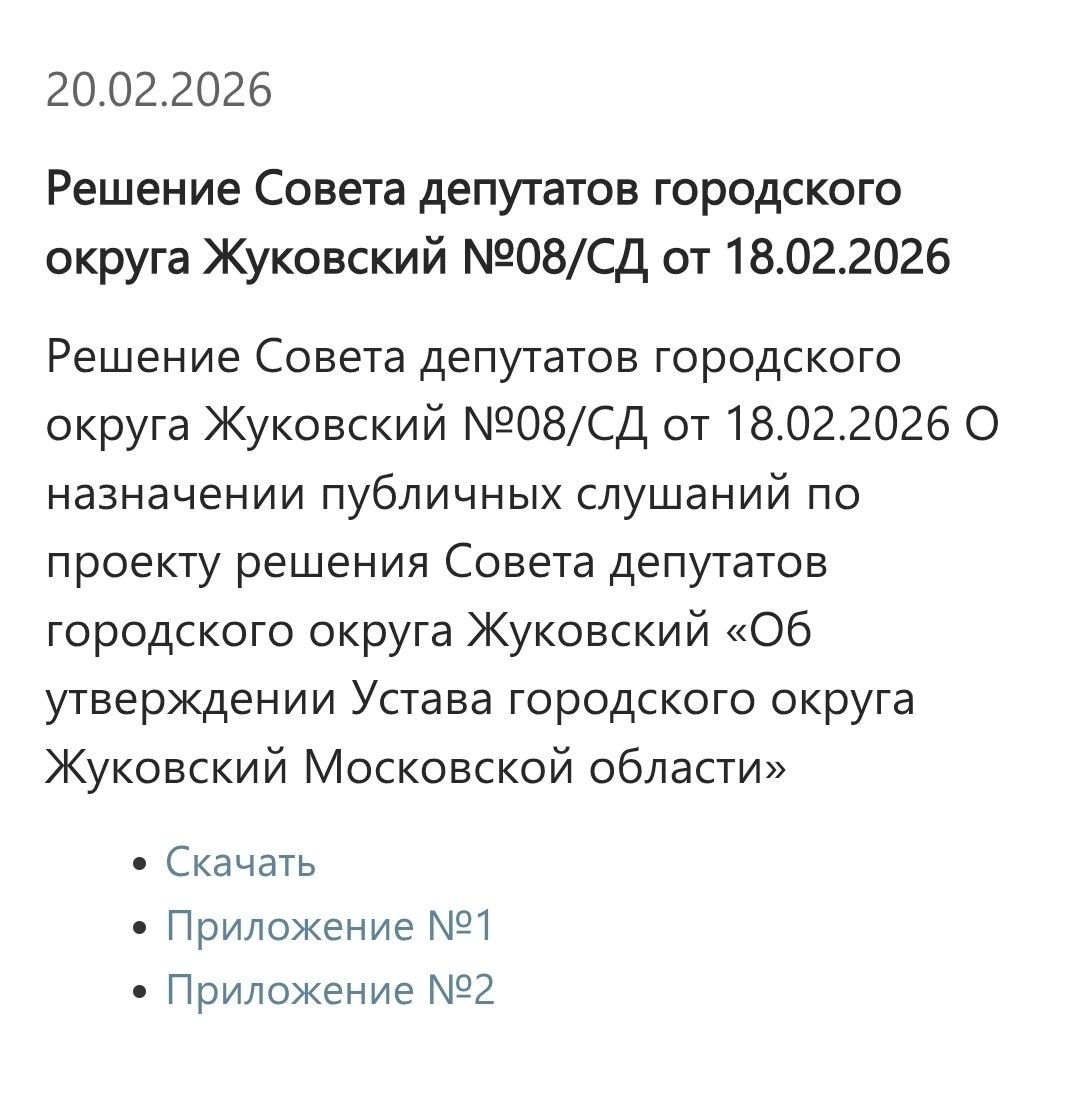 Счастье любит тишину. На заседании депутатов г. Жуковского 18.02.2026 года было принято решение о назначении публичных слушаний по проекту решения СД "Об утверждении Устава городского округа Жуковский МО" Публичные слушания пройдут 26.03 в 15.00 в зале 9 этажа Администрации г.о. Жуковский. До 25 марта свои предложения и замечания можно отправить в Совет депутатов по электронной почте sd_zhukovskiygo@mosreg.ru, а можно и лично поучаствовать - регистрация участников с 14.30 до 15.00. Среди нововведений уточнение о преобразовании городского округа - объединении с иным (иными) муниципальными образованиями, разделении городского округа или изменение вида муниципального образования. Нас тихо готовят к чему-то масштабному, большому, целому..... @zhuk_city