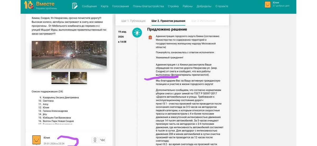 Спустя два месяца мэрия Химок начала массово закрывать обращения на «Доброделе» как якобы успешно выполненные. Речь о заявках по уборке дорог и парковок от снега. Почти по всем обращениям теперь приходит один и тот же ответ: «работы выполнены». В подтверждение — фотографии… растаявшего снега 🙈😡 По факту на календаре уже конец марта и пришла весна, и мэрия с подрядчиками рьяно взялись «чистить» территории — задним числом, постфактум, когда снег уже исчез сам. Возникает закономерный вопрос: как это вообще можно назвать? И зачем к закрытым заявкам прикрепляются сроки выполнения, которые очевидно не соблюдались? Мы продолжаем фиксировать фактическую дискредитацию губернаторского сервиса «Добродел» в Химках. @himkigo