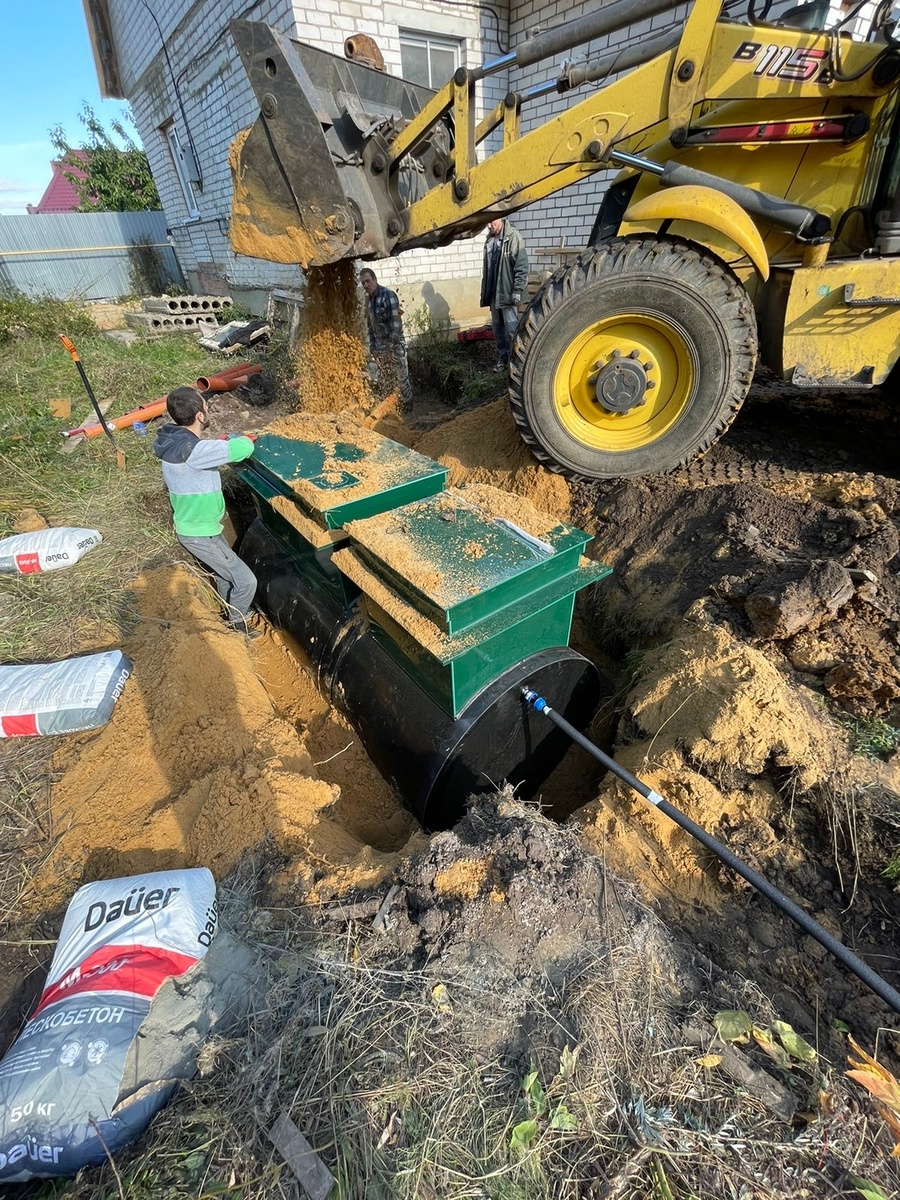 При высоком УГВ рекомендуется засыпка ЦПС — она создает дополнительную фиксацию корпуса в грунте.