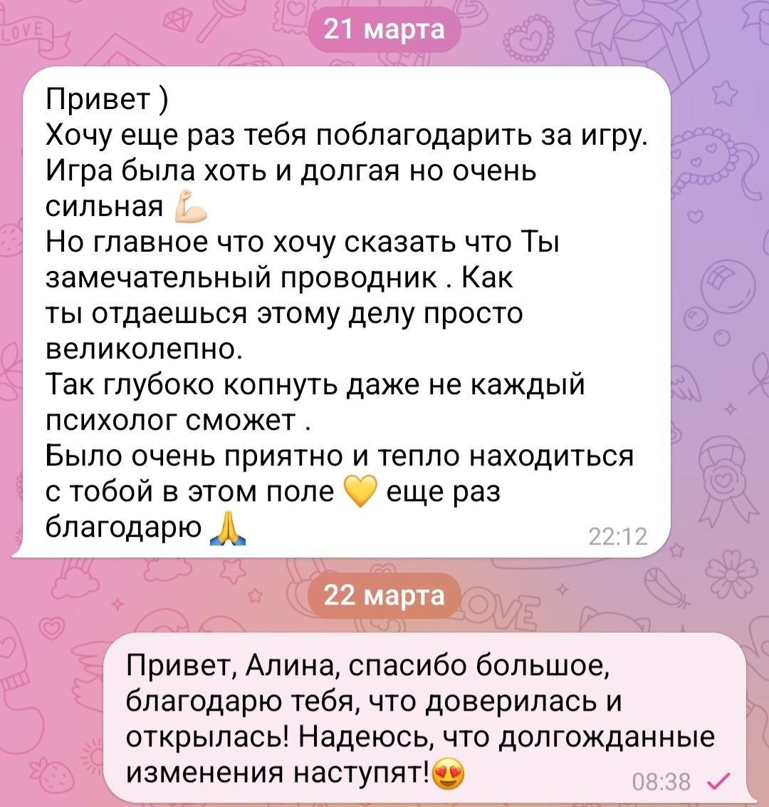 ! Если хотите решить свой запрос через игру, пишите в лс, подберём дату игры. Почему ИГРА? Игра — это особый формат, в котором человек расслабляется, перестаёт защищаться и выходит из привычного контроля ума, попадая в состояние открытости и живого проживания; через образы, символы и действия он начинает проявлять свои реальные сценарии, реакции и внутренние ответы, как в мини-модели жизни, но в безопасном пространстве без давления и страха ошибки, поэтому решения приходят не извне, а рождаются изнутри — естественно, честно и глубоко. Какие игры можем пройти? 🎲Игра Лила - любой запрос, стоимость от 1500 🎲"Путь к здоровью" - выяснение причин симптома и пути исцеления. Стоимость 1900 🎲"Ключ к подсознанию". Карта души, теней, сильных сторон, смыслов. Стоимость 790 🎲"Сферы жизни" - любой запрос. Стоимость 890 Записаться к мастеру t.me/alexandradulchy