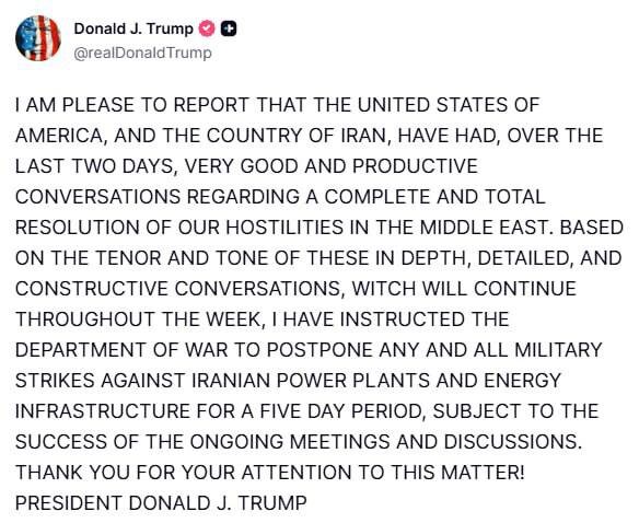 На этом фоне заявление Дональда Трампа о временной паузе в военных действиях выглядит как попытка снизить градус напряженности. По его словам, после «очень удачных» переговоров между США и Ираном принято решение отложить удары на пять дней.