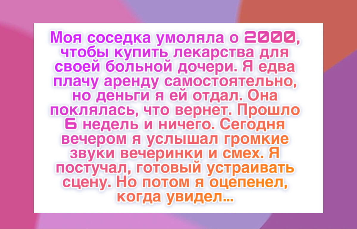 “Моя соседка умоляла занять ей 2000 на лекарства для ее больной девятилетней дочери. Я сам еле платил за квартиру, но дал ей деньги. Она клялась, что вернет.