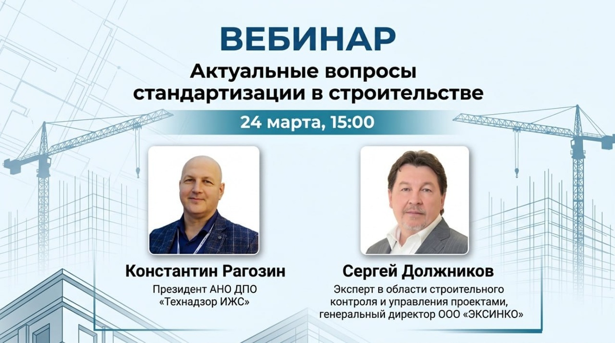 24 марта в 15:00 проводим вебинар для специалистов строительного контроля и экспертизы. Спикер — Сергей Должников Эксперт в области строительного контроля, генеральный директор ООО «ЭКСИНКО», участник разработки СП 471.1325800.2019 и СП 543.1325800.2024. Программа: ✔️ Новые стандарты отделочных работ Что изменилось в требованиях, какие узлы вызывают споры и как правильно фиксировать нарушения. ✔️ Проект ГОСТ по инструментальному контролю Какие измерения станут обязательными, какие приборы использовать и как оформлять результаты. После выступления Сергея — Константин Рагозин (Президент АНО ДПО «Технадзор ИЖС», председатель комитета по строительному контролю в АМЖС) расскажет о тенденциях на рынке строительного контроля в ИЖС, а также о новых возможностях для профессионального развития. 📅 24 марта, 15:00 ⏱️ Длительность: около часа 🔗 Ссылку на подключение пришлем личным сообщением. Ставьте + под постом. Или присылайте сообщение каналу.