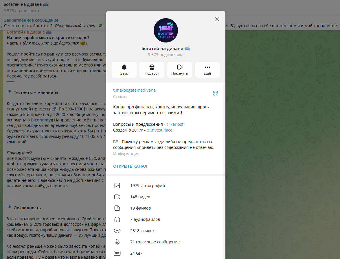 Наткнулся на канал «Богатей на диване» — типичный крипто-блог: инвестиции, заработок, советы. Сначала кажется, что всё ок: посты выходят, темы актуальные, ничего откровенно мошеннического не видно. Но если немного вчитаться — начинаешь ловить странное ощущение: вроде пишут много, а по факту толку мало. Если не хочется гадать, где инфа полезная, а где просто вода, лучше сразу смотреть более понятные варианты. Канал не самый маленький — около 9.5 тысяч подписчиков. Тематика стандартная: • крипта