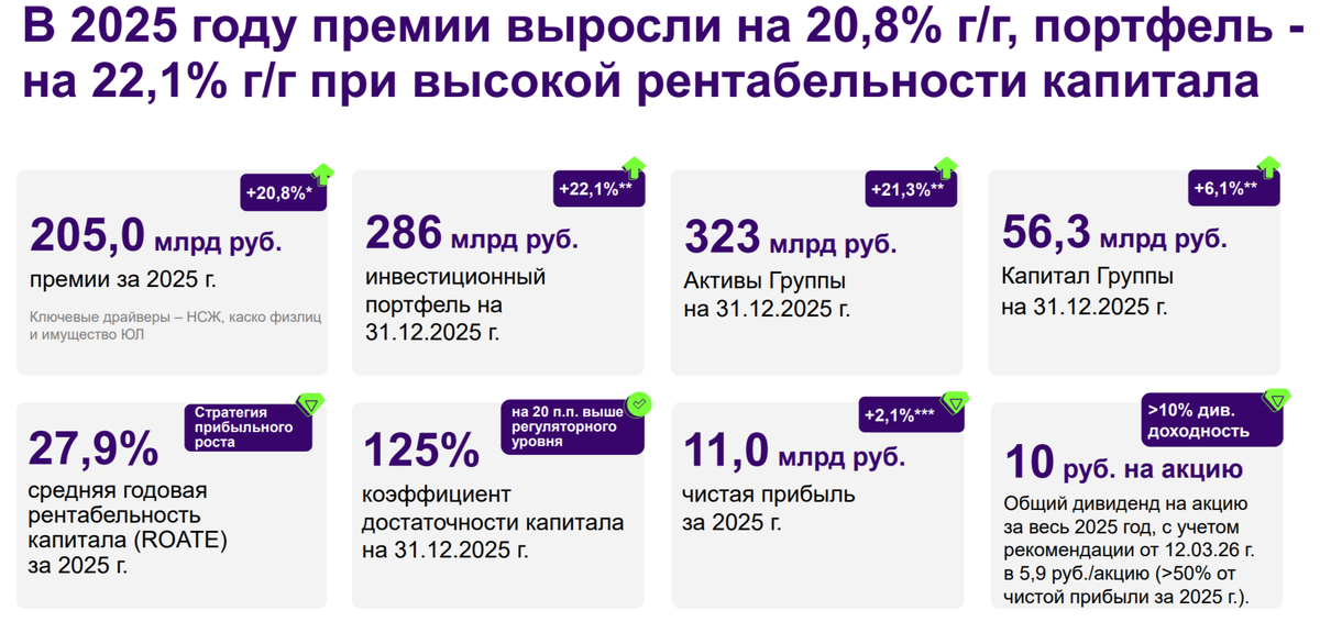 📞 Чистая прибыль: 11₽ млрд (+2,1% г/г) 🟣 Компания имеет 2 основных вида страхования, премии: life — 130,2₽ млрд (+35% г/г, продажи НСЖ взлетели из-за расширения территории, плюс по нему можно взять налоговый вычет), non-life — 74,8₽ млрд (+2% г/г, помогло автострахование и рост страхо