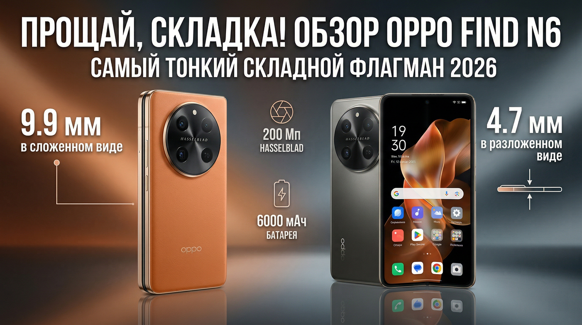Складные смартфоны долгое время считались «игрушкой для гиков» — слишком толстые, с заметной полосой посередине и сомнительной автономностью. Но в марте 2026 года Oppo выпустила Find N6, и, кажется, индустрия изменилась навсегда. Я разобрал новинку по полочкам: от «невидимого» шарнира до камеры на 200 Мп. Давайте выясним, стоит ли он своих денег. Первое, что шокирует при знакомстве с Find N6 — его толщина. В разложенном состоянии она составляет всего 4,21 мм. Это тоньше, чем многие современные планшеты! В сложенном виде — 8,93 мм, что сопоставимо с обычными флагманами вроде iPhone 17 или Galaxy S26 Ultra. Главная гордость Oppo — технология Zero-Feel Crease. Благодаря новому шарниру, напечатанному методом 3D-жидкостной печати, складка на внутреннем 8,12-дюймовом экране практически исчезла. Ее не видно под углами и, что важнее, она почти не ощущается пальцем. Раньше складные смартфоны всегда проигрывали обычным флагманам в качестве фото. Oppo Find N6 закрывает этот вопрос: Цветопередача