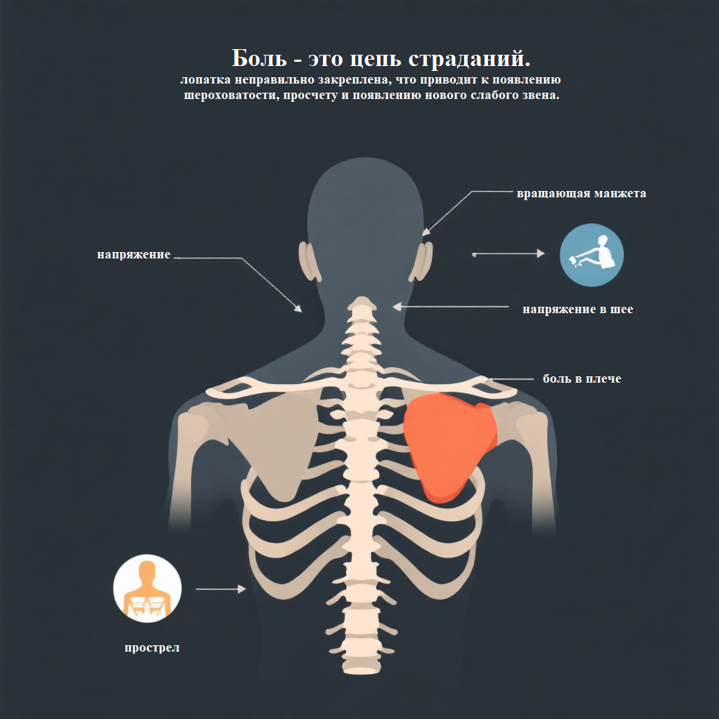 Представь, что твоя лопатка — это надежный фундамент для крана (твоего плеча). Если фундамент шатается, кран не может поднять груз правильно, его механизмы (сухожилия, мышцы) изнашиваются в десять раз быстрее. Вот что происходит в твоем теле, и глубже: