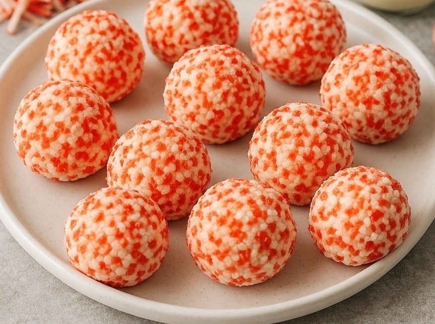 Формируем небольшие шарики мокрыми руками и обваливаем в красной стружке.