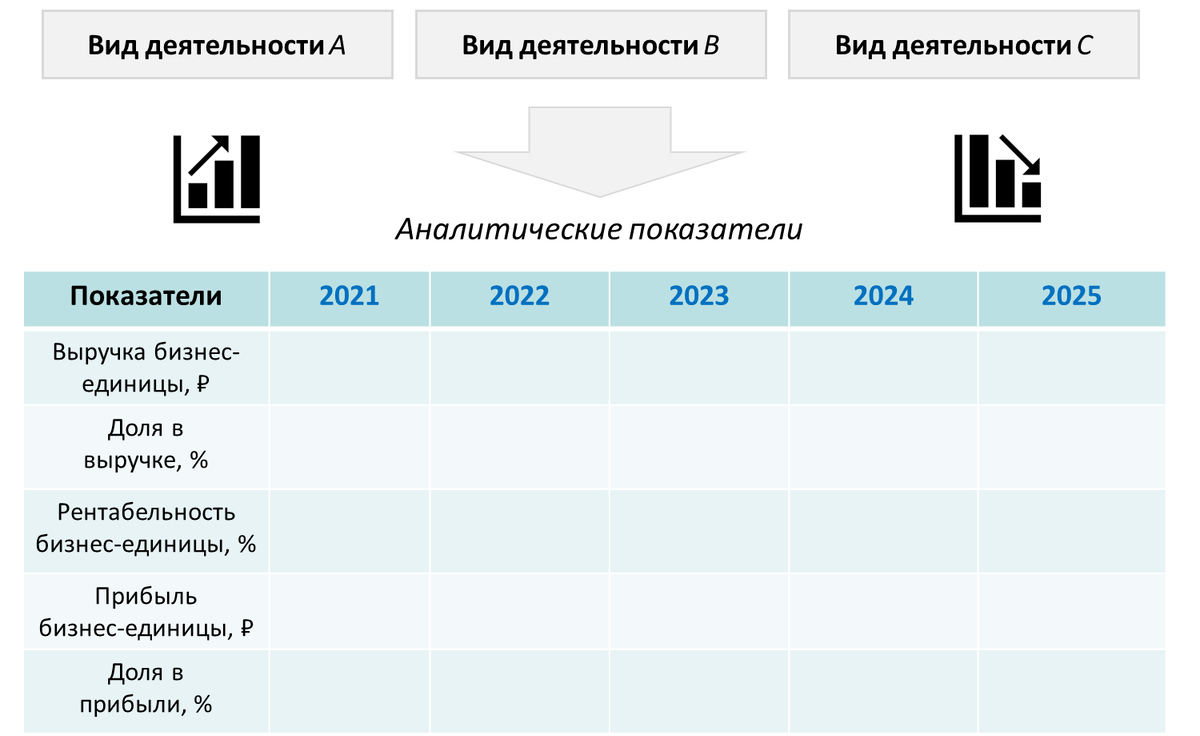 На этапе стратегического анализа мы провели большую и кропотливую работу по описанию бизнес-модели, но оно того стоит. В результате мы качественно разобрались с содержанием нашей деятельности на данный момент и разложили ее, насколько это было возможно, на «молекулы и атомы». Но хотелось бы еще качественную картинку дополнить количественным анализом. Это нам пригодится в дальнейшем при проектировании целевой бизнес-модели и принятии стратегических решений. Анализ текущей бизнес-модели мы можем проводить последовательно по соответствующим блокам шаблона. И первый шаг - анализ бизнес-портфеля нашей компании. Если в нашем бизнес-портфеле в настоящее время находится несколько видов деятельности, то по каждому из них интересно и полезно посмотреть, какую выручку и прибыль они генерируют в абсолютном и относительном выражении. Причем, посмотреть не только здесь и сейчас, но и в динамике за прошедшие 3-5 лет. Это можно сделать для каждого вида деятельности (бизнес-единицы) с помощью нескольк