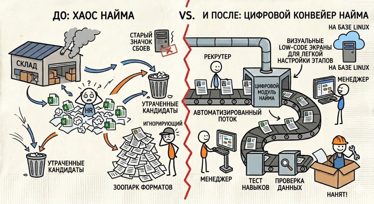 Невозможно запустить новую производственную линию, потому что не хватает пяти наладчиков станков с ЧПУ. Заказы горят, инвесторы нервничают. Директор по персоналу пожимает плечами, утопая в горе резюме, рассыпанных по почтовым ящикам, мессенджерам и десяткам Excel-таблиц. Ошибка в данных при передаче кандидата от рекрутера к начальнику цеха стоит недель простоя. Это реальность производства без цифрового модуля найма. Собственно, самый важный вывод: модуль найма для промышленного предприятия — это не «красивая картинка» для HR, а критически важная часть производственной системы. Его главная задача — превратить хаос поиска людей в управляемый конвейер по поставке компетенций, интегрированный с общим контуром управления (ERP). Это позволяет сократить время простоя оборудования из-за дефицита кадров и избежать приема «случайных» людей на ответственные позиции. Представляется разумным рассмотреть, как это работает «под капотом». До внедрения специализированного модуля процесс найма на заводе
