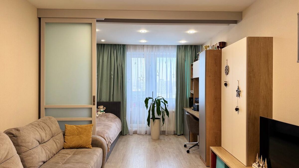 ⬇️ В этом проекте она разделяет детскую и гостиную зоны. Перегородка выполнена в деревянном профиле с покрытием экошпон (цвет пепельный). Матовое стекло добавляет приватности. Отдельный момент — перемычки, смещённые ниже центра. За счёт этого появляется ощущение, что потолок выше, а пространство — легче. И ещё одно важное преимущество — телескопическая система: перегородку можно открыть или закрыть, взявшись за любую створку — они плавно двигаются друг за другом. И да, приятный бонус для детской — ими просто не получится хлопнуть. Всё закрывается мягко и спокойно, без лишнего шума. Полностью безопасная история. Как вам такое зонирование детской? ❤️ Если тоже думаете о перегородке — напишите нам, подберём вариант под ваш интерьер.