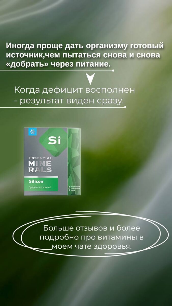 Всем привет💭 Желаю всем отличного дня😊 Давайте отвлечемся от новостей и поговорим о самом важном, что у нас есть - это здоровье! 📌Сегодня в чате про минерал, о котором редко говорят, но он играет очень важную роль. И если в организме есть его дефицит - вы это заметите!👉https://t.me/c/2720766675/50 Есть элемент, про который почти не говорят - кремний ‼️Но именно он влияет на состояние кожи, волос, ногтей и даже на прочность костей и работу суставов. Плюс - он важен для иммунитета 📌помогает легче переносить нагрузки и быстрее восстанавливаться. Когда его не хватает, это становится заметно: •кожа теряет упругость •волосы истончаются •ногти становятся слабее И часто мы не связываем это с дефицитом Хотя причина может быть именно в этом 💭В своем чате здоровья я подробно делюсь рабочим кремнием. Присоединяйтесь!https://t.me/+_5fltPCLX502ZmQy