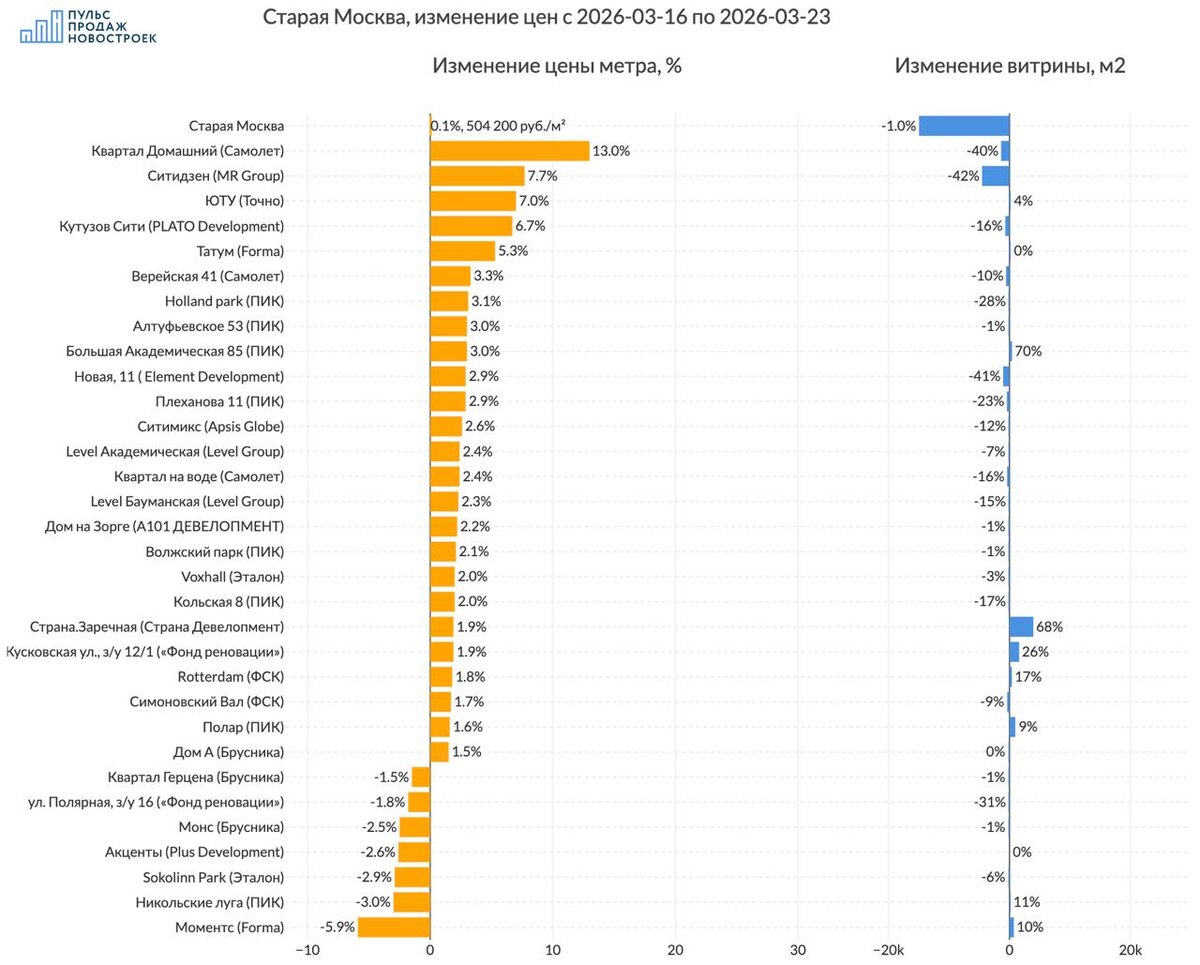 💰 Смотрим без премиум и элит классов. 💵 За 7 дней цена метра выросла на 0.1% до 504 200 рублей за метр. 📈Топ изменения цен (подорожало): 1️⃣ЖК "Квартал Домашний" (Самолет) цена метра +13.0%, витрина предложения уменьшилась на 1398м2 2️⃣ЖК "Ситидзен" (MR Group) цена метра +7.7%, витрина предложения уменьшилась на 4544м2 3️⃣ЖК "ЮТУ" (Точно) цена метра +7.0%, объем витрины при этом увеличился на 187м2 🪫Анти топ (подешевело): 1️⃣ЖК "Моментс" (Forma) -5.9% в цене, объем витрины при этом увеличился на 707м2 2️⃣ЖК "Никольские луга" (ПИК) -3.0% в цене, объем витрины при этом увеличился на 139м2 3️⃣ЖК "Sokolinn Park" (Эталон) -2.9% в цене, витрина предложения уменьшилась на 126м2 ☄️Объем предложения жилья в регионе ниже -1.0%(-14958 м2) Все изменения в регионе на картинке. ‼️Только для наших подписчиков в телеграмм два сайта - сервис истории цен для поиска выгодных предложений и аналитики по проектам ПИК - рейтинг продаж ЖК с историей 🔥 @pulsprodaj