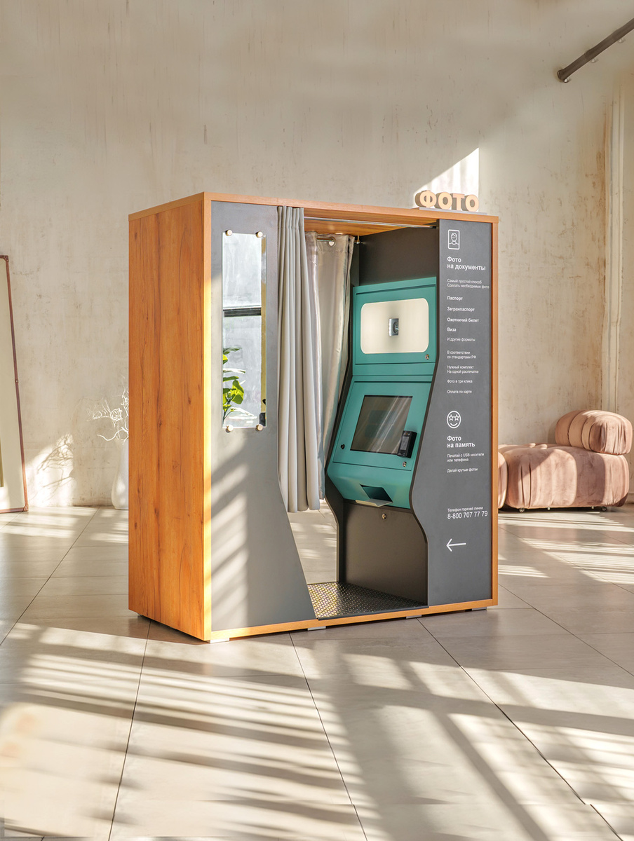 бюджетной. Спойлер: мы справились! Автомат получил крепкий О-образный корпус из ЛДСП. Простенки выполнили функцию надёжных рёбер жёсткости. Мы тщательно продумали технологическое размещение оборудования, эргономику и даже фокальные особенности фототехники. А ещё мы предложили несколько концептуальных решений. Одно из них —