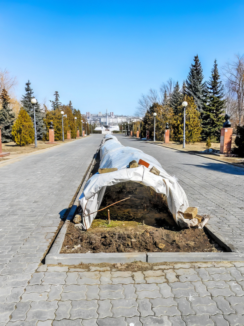 Сегодня, 23 марта, рабочие "Благоустройства" вышли на просохшую главную аллею парка Победы в Камышине снимать укрытия розариев. Здесь, у администрации, выращивают лучшие в городе сорта царицы цветов.