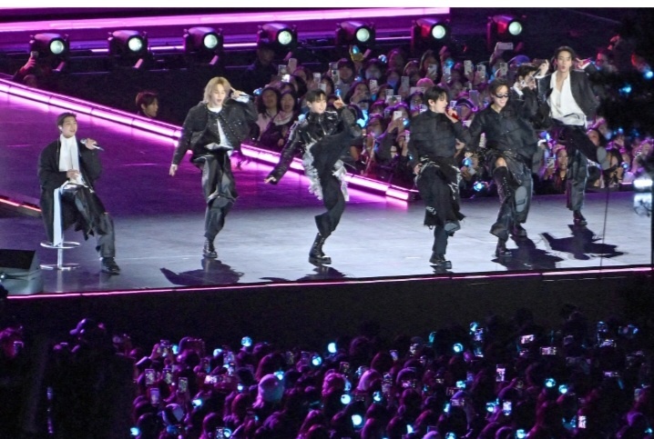 Площадь, обычно наполненная деловым ритмом мегаполиса, в тот вечер преобразилась. Она окрасилась в фиолетовый — фирменный цвет BTS и их фанатов, ARMY. Около 22 тысяч зрителей смогли попасть на огороженную концертную территорию, а ещё свыше 100 тысяч наблюдали за происходящим с уличных экранов. Для миллионов поклонников по всему миру шоу транслировалось в прямом эфире на Netflix в более чем 190 странах.