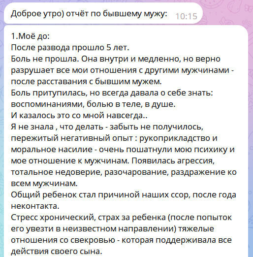 Прошел животный страх, который постоянно проявлялся, когда мне звонил бывший муж или когда ребенок был у него.