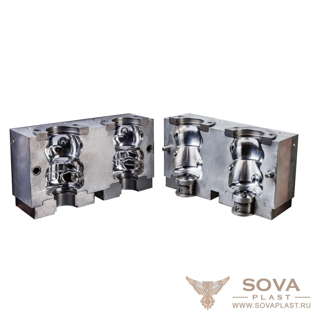 Состоит из двух половин — подвижной и неподвижной. При смыкании образуется полость, куда под давлением подается разогретая преформа. Воздух раздувает ее, материал заполняет стенки формы.