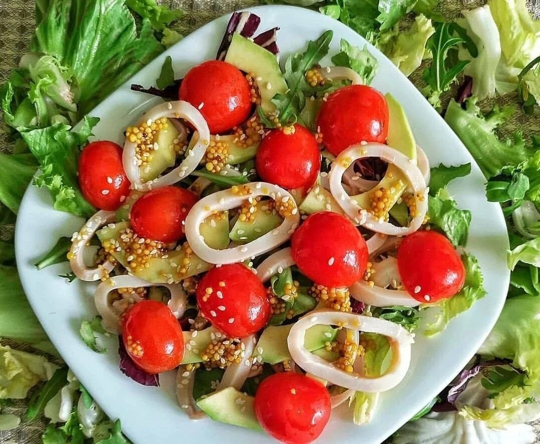 кальмарами и авокадо. Быстрый, вкусный, сытный и в тоже время легкий. КБЖу на всю порцию 241/14,3/15,1/14,7 Ингредиенты: кальмары-70 грамм Авокадо-60 грамм Помидоры черри-120 грам Листья салата-50 грамм Зернистая горчица-1 ст.л Оливковое масло-1 ч.л Лимонный сок-1 ч.л. Соль по вкусу 1.Кальмары моем, чистим, отвариваем 2 минуты и маринуем оливковое масло + соль. 2. Авокадо нарезаем дольками и поливаем лимонным соком. З. Соединяем все ингредиенты- листья салата, помидоры, авокадо, кальмары, зернистая горчица. Приятного аппетита.