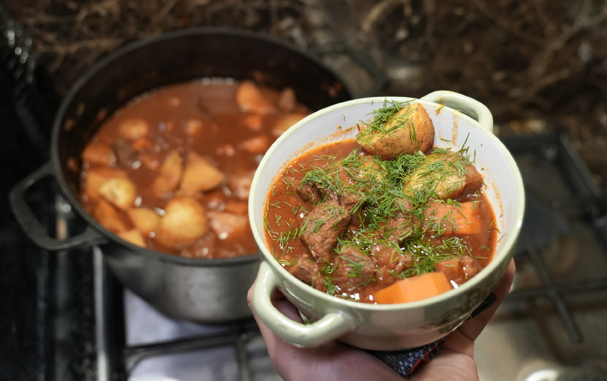 Жаркое из говядины с картофелем! Простой и вкусный рецепт Ингредиенты: ≈1,2 кг говядины (бедро) 4 лука (≈ 500-600 г) 4 морковки (≈ 600 г ) 250 г томатной пасты (достаточно будет и 150 г) 6 зуб чеснока ≈1,3 кг картофеля Специи: соль, черный перец, лавровый лист 1 ч.л. сахара Растительное масло для жарки Приготовление: 1. Нарезаем говядину небольшими кусками, мелко нарезаем лук, небольшими дольками нарезаем морковь и кубиком нарезаем картофель и отправляем его в воду чтобы не потемнел; 2. На сильном огне разогреваем чугунную кастрюлю(или кастрюлю с толстым дном), отправляем в нее подсолнечное масло и когда все разогрелось, отправляем мясо, разравниваем его по дну и не трогаем пока не образуется корочка(примерно 3-4 минуты), затем перемешиваем и обжариваем мясо со всех сторон, при этом выпариваем лишнюю влагу; 3. Как мясо перестало вариться и начало шкварчать, добавляем нарезанный лук(и еще чуть-чуть растительного масла, если надо) и обжариваем пока лук не станет прозрачным (примерно 5 ми