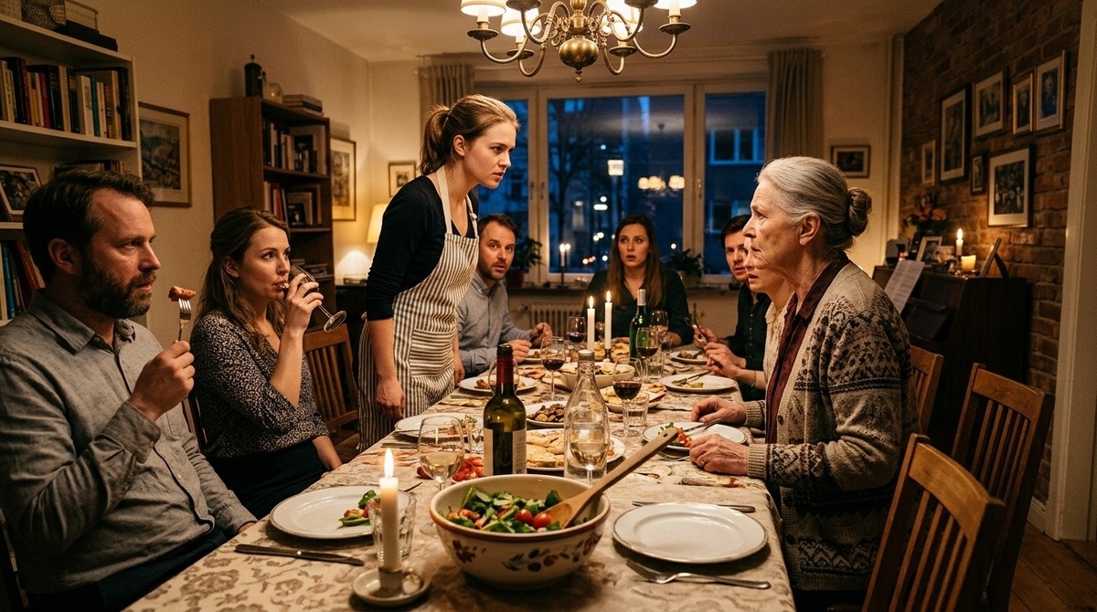 В комнате звенели вилки, пахло запечённым мясом, укропом и сладкими духами Зои. Свеча у салатницы коптила тонкой струйкой, а свекровь сидела во главе стола с лицом человека, который решил подвести итоги чужой жизни. За столом сидели двенадцать гостей.