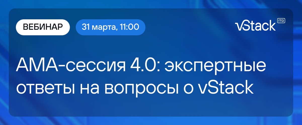 2026 год продолжает быть годом активного импортозамещения. В этот период особенно важно, чтобы производитель был максимально открыт к диалогу. Именно поэтому мы проводим открытую AMA-сессию 4.0 с генеральным директором vStack Евгением Карповым. Это уникальная возможность напрямую обсудить настоящее и будущее платформы vStack. Кому это будет особенно полезно: 🔘Системным администраторам 🔘Архитекторам ИТ-инфраструктуры 🔘ИТ-директорам 🔘Собственникам бизнеса 🔘Облачным провайдерам Мы ждем ваши вопросы на почту info@vstack.com до 25 марта включительно. «Мы вступаем в 2026 год с пониманием, что российские продукты должны быть не просто альтернативой, а полноценными инструментами, которыми удобно пользоваться. Формат AMA позволит нам глубже понять потребности рынка и сориентировать развитие продукта в русле реальных запросов пользователей», — Евгений Карпов, генеральный директор vStack. Дата и время вебинара: 31 марта в 11.00 Спикер: Евгений Карпов, генеральный директор vStack Сбор в