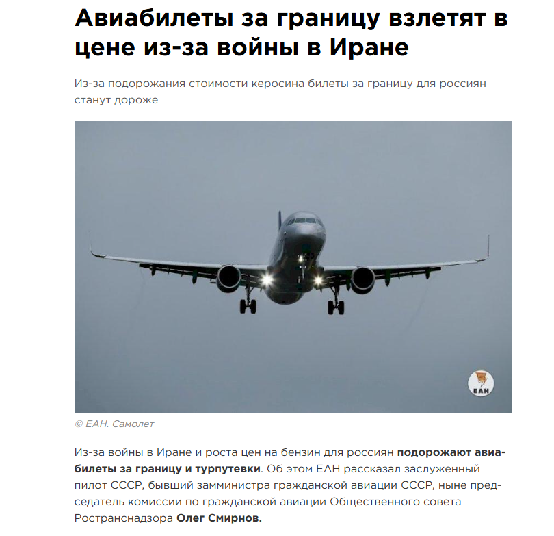 Из-за войны в Иране и роста цен на бензин для россиян подорожают авиабилеты за границу и турпутевки. Об этом ЕАН рассказал заслуженный пилот СССР, бывший замминистра гражданской авиации СССР, ныне председатель комиссии по гражданской авиации Общественного совета Ространснадзора Олег Смирнов. «События в Иране всколыхнули весь мир. И мы так или иначе, будучи вплетенными в мировую экономику, тоже это почувствуем. Что касается внутренних перевозок, то тут переживать не стоит, как некоторые считают, что у нас будут проблемы с топливом и так далее. Наша промышленность, наш авиационный рынок способны полностью удовлетворить потребности авиации необходимым количеством авиакеросина, потому что заводы по производству из нефти керосина продолжают работать. Но вот что касается международных перевозок, то, конечно, это коснется наших авиакомпаний и их расходов, связанных с авиакеросином. Из-за этого расходы авиакомпаний будут увеличиваться, следовательно, будет расти и цена перевозки, то есть цена