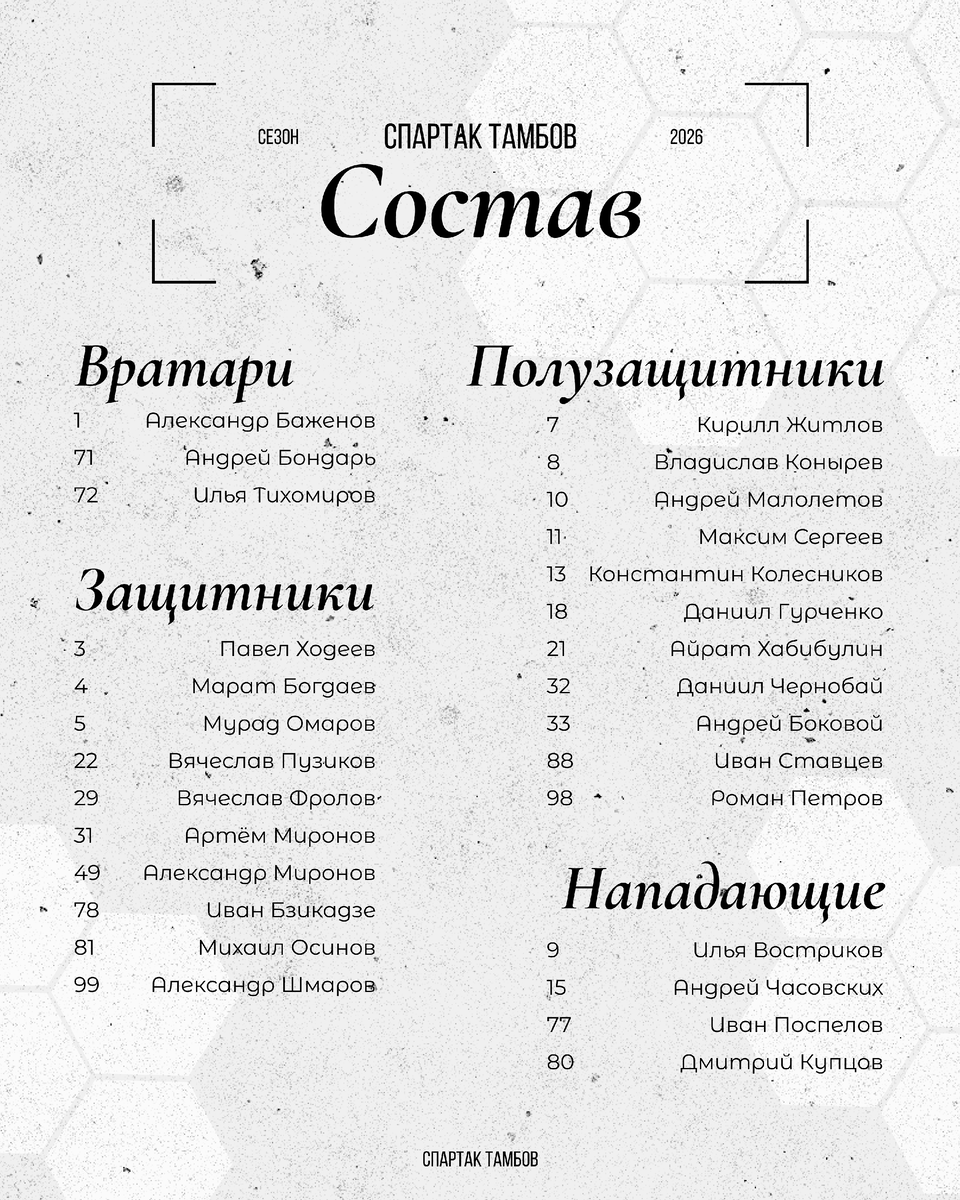 Межсезонье для тамбовского «Спартака» выдалось одним из самых активных за последние годы. Клуб подписал 13 новых футболистов, среди которых есть как опытные бойцы, прошедшие Первую лигу, так и молодые воспитанники академий, для которых этот сезон станет первым профессиональным. На сегодняшний день состав полностью укомплектован - 28 игроков, которые в купе с тренерским штабом будут добывать победы в каждом матче. Состав команды: вратари: Баженов Александр, Бондарь Андрей, Тихомиров Илья; защитники: Богдаев Марат, Омаров Мурад, Ходеев Павел, Фролов Вячеслав, Осинов Михаил, Миронов Артем, Пузиков Вячеслав, Бзикадзе Иван, Шмаров Александр; полузащитники: Петров Роман, Хабибулин Айрат, Ставцев Иван, Колесников Константин, Сергеев Максим, Чернобай Даниил, Житлов Кирилл, Гурченко Даниил, Малолетов Андрей, Боковой Андрей, Конырев Владислав, Миронов Александр; нападающие: Часовских Андрей, Купцов Дмитрий, Поспелов Иван, Востриков Илья.