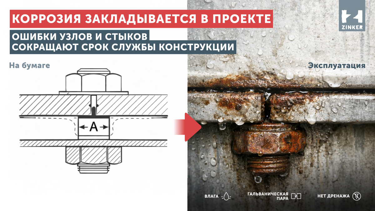 Как вы уже тоже знаете, существует целый ряд факторов, способствующих развитию коррозии. И помимо «естественных» - например, природной восприимчивости металла к коррозионным процессам или специфического состава воздуха на тех или иных территориях, где размещена металлоконструкция - есть также факторы конструктивные, технологические и эксплуатационные.
