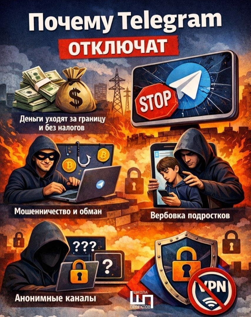 В последние недели многие заметили: — сообщения отправляются медленно — фото и видео грузятся через раз — у кого-то Telegram работает только с VPN По информации из СМИ: в начале апреля мессенджер могут полностью заблокировать. И всё чаще звучит версия: что даже VPN не поможет. Почему к Telegram столько вопросов? 1️⃣ Огромные деньги от рекламы через Telegram Платформа иностранная, поэтому значительная часть рекламных доходов уходит из России и зачастую не облагается налогами внутри страны. Поэтому государство всё чаще говорит о необходимости регулировать подобные площадки и финансовые потоки, через них проходящие. 2️⃣ Мошенничество Фейковые инвестиции, «лёгкий заработок», поддельные магазины — значительная часть таких схем распространяется именно через Telegram, в том числе через закрытые чаты и шифрованную переписку. 3️⃣ Вербовка подростков Это одна из самых серьёзных проблем. Через закрытые каналы подростков вовлекают в мошеннические и даже террористические схемы. При этом отс