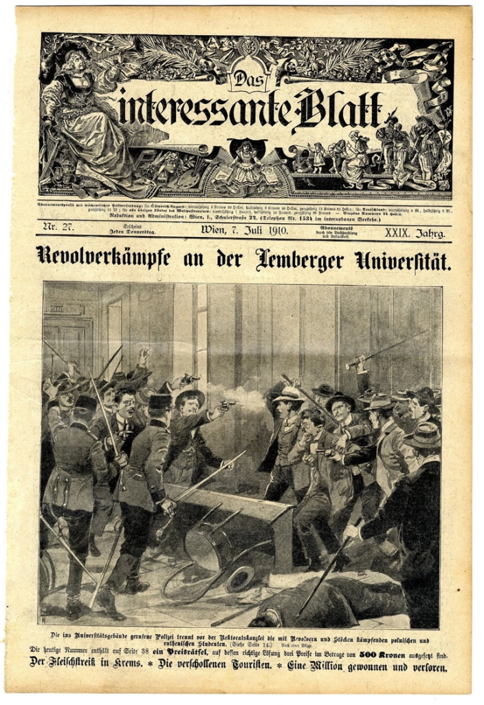 Первая иллюстрация — это скан с титула австрийского журнала «Das interessante Blatt» от 7 июля 1910 года. Украинские историки радостно таскают его, сопровождая рассказом о том, как студенты-украинцы Львовского университета отстаивали своё «национальное достоинство» в стычках с поляками. В подписи к картинке на титуле сказано: Револьверные бои в Лембергском университете. Но дальше следует то, на что надо обратить внимание: Полиция, вызванная в здание университета, пробивается к канцелярии ректора через дерущихся польских и русинских студентов. Ни о каких украинцах речи не идёт. Австро-Венгрия, приложившая усилия в создании «новой нации», в делах внутренних была осторожна. Крупные журналы, говоря о столкновении славянских групп, не называли одну из них украинцами. «Русины», «рутены», то есть группа русских, но не «украинцы». Польские СМИ тоже писали о столкновениях с русинами – например, Краковская газета «Nowości illustrowane». Что же тогда произошло? Этнический состав Львова в начале Х