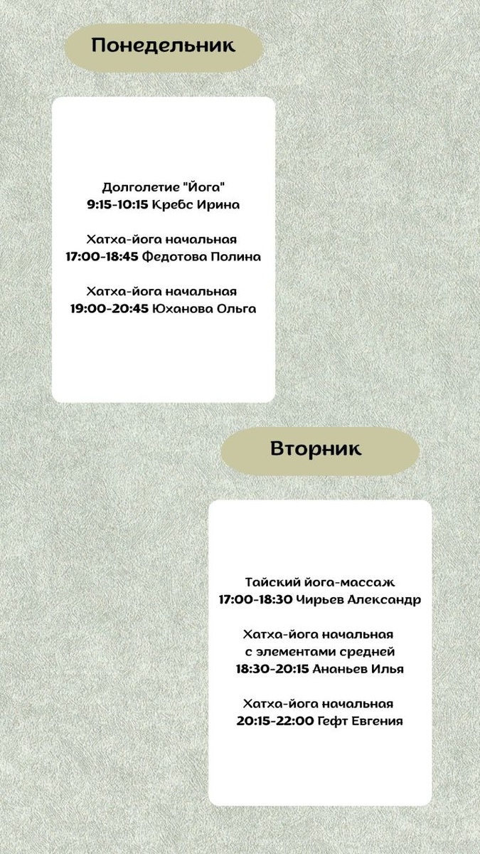 🤩 Расписание на 23 - 29 марта🤩 Ждём каждого практикующего на наших классах очно и онлайн🙏 ‼️Обратите внимание на изменения в расписании 1. Киселев Алексей до 4 апреля ведёт семинар в Индии, поэтому его занятия заменяют другие преподаватели. 2. Ирина Кребс приболела и во вторник её занятие отменяется. В четверг занятие состоится. 3. Класс медитации по пятницам отменен до лета. Ждём всех в нашей студии, запись на нашем сайте💫 *Запись на большинство классов возможна после предоплаты. Купить разовое занятие или абонемент вы можете в разделе стоимость