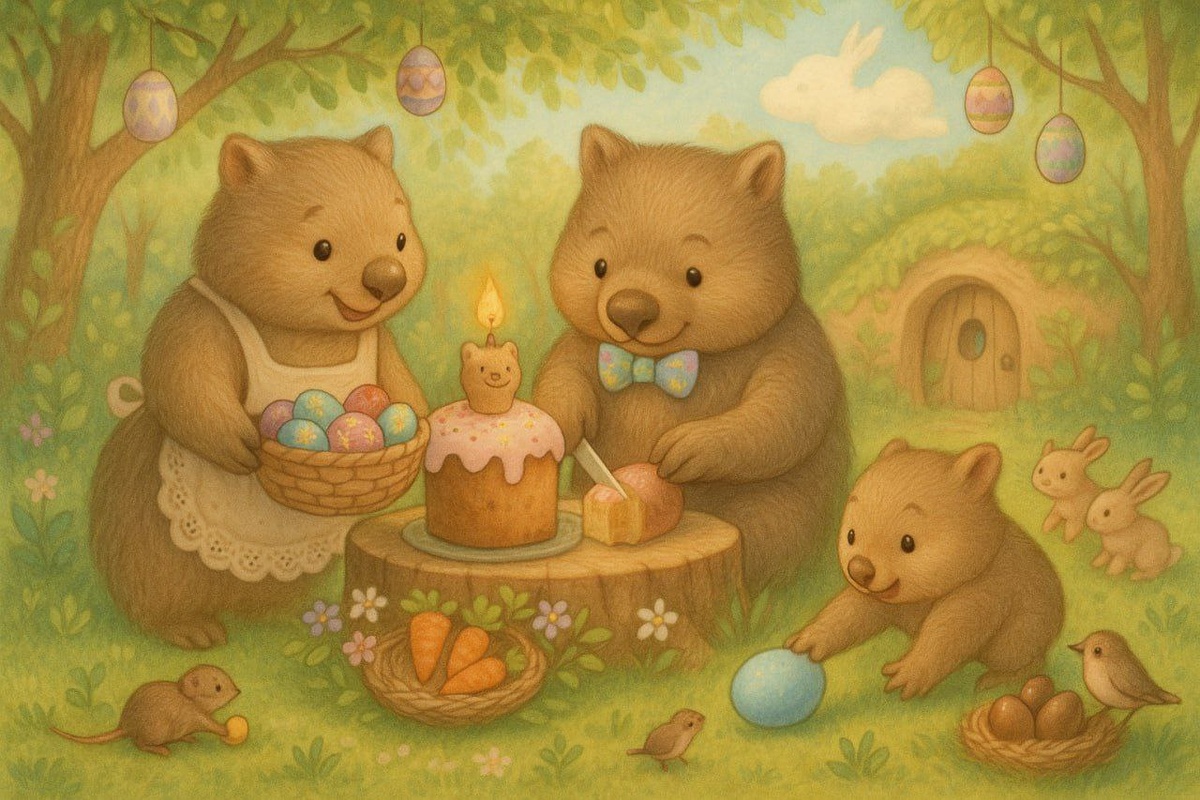 Яркое весеннее солнце пробивалось сквозь листву эвкалиптов, а в уютной норке семьи вомбатов царило праздничное оживление. Сегодня был особенный день — Пасха. День, когда даже в мире зверей чувствовалось дыхание чуда.