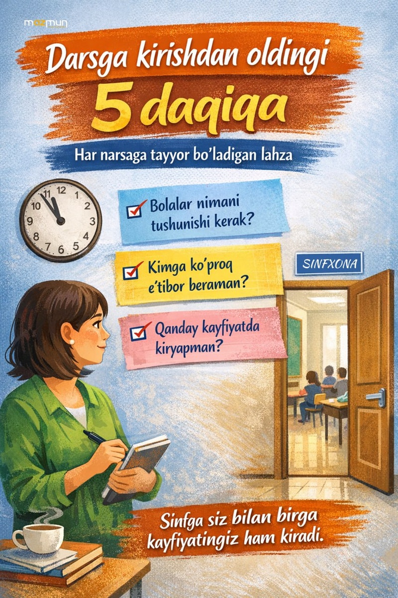 Darsga kirishdan oldingi 5 daqiqa ham juda muhim Ko‘pincha dars qo‘ng‘iroq chalingandan keyin boshlanadigandek tuyuladi. Aslida esa ustoz uchun dars undan oldingi bir necha daqiqada boshlanadi. Shu paytda ustoz biroz "yig‘ib" (yaxshi ma'noda😃) olsa, dars ham boshqacha o‘tadi. O‘zingizga mana bu 3 ta savol bering: - Bugun bolalar nimani tushunib chiqishi kerak? - Bu safar kimlarga ko‘proq e’tibor berishim lozim? - Sinfga qanday kayfiyat bilan kiryapman? Ba’zan yaxshi darsning siri murakkab metodda emas, shunchaki darsga tayyor holatda kirishda bo‘ladi. Unutmang, siz sinfga faqat o‘zingiz kirmaysiz. Siz bilan birga kayfiyatingiz ham kiradi. Endi, navbatdagi darsingizdan oldingi 5 daqiqaga e’tibor berib ko‘ring. Balki aynan shu narsa darsingizni o‘zgartirar. 💬 Siz darsdan oldin o‘zingizni qanday tayyorlaysiz? Izohlarda yozib qoldiring. 😊 Mazmun - doimiy rivojlanuvchi ustozlar uchun! 📱 Telegram | 📱 Instagram | 😎 Facebook| 😎 You Tube