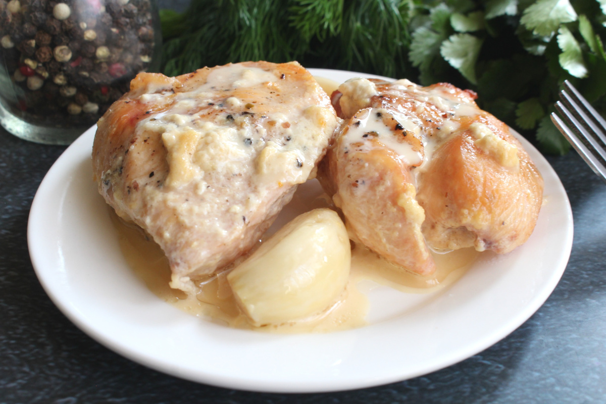 Запеченная куриная грудка в молоке - это простой способ приготовить мясо так, чтобы оно осталось сочным и мягким. Молоко смягчает волокна куриного мяса, помогает сохранить влагу и придает легкий сливочный вкус блюду. Такая запеченная грудка вкусная как в горячем, так и в холодном виде. В рецепте было дано две куриные грудки, но точный вес мяса указан не был. Я использую примерно 600 г. мяса. Мясо можно не резать, а запекать грудки целиком или разделить грудку на две половины. Лимонную цедру добавляем по вкусу, в рецепте указано две полоски, длины полосок не дано. Грудка куриная - 600 г. Чеснок - 5-6 зуб. Молоко - 1 стакан Масло сливочное - 2 ст.л. Цедра лимонная - две полоски Смесь перца свежемолотого - 2-3 щепотки Соль - по вкусу Куриную грудку промоем, обсушим и нарежем крупно. Посолим, поперчим мясо и перемешаем. На сковороде растопим сливочное масло и обжарим мясо быстро со всех сторон, только до легкой корочки. В форму для запекания выложим очищенные зубчики чеснока. Мясо выложим