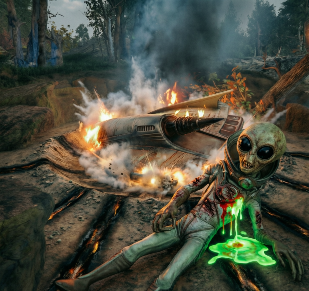 Зеленый человечек лежал на боку, пытаясь подняться. Руки его — длинные, с непривычно большими суставами — царапали землю, но тело, видимо, слушалось плохо. При каждом движении из-под обшивки комбинезона выступала странная жидкость. Она светилась в темноте слабым, фосфоресцирующим светом и имела густую, неестественную консистенцию.