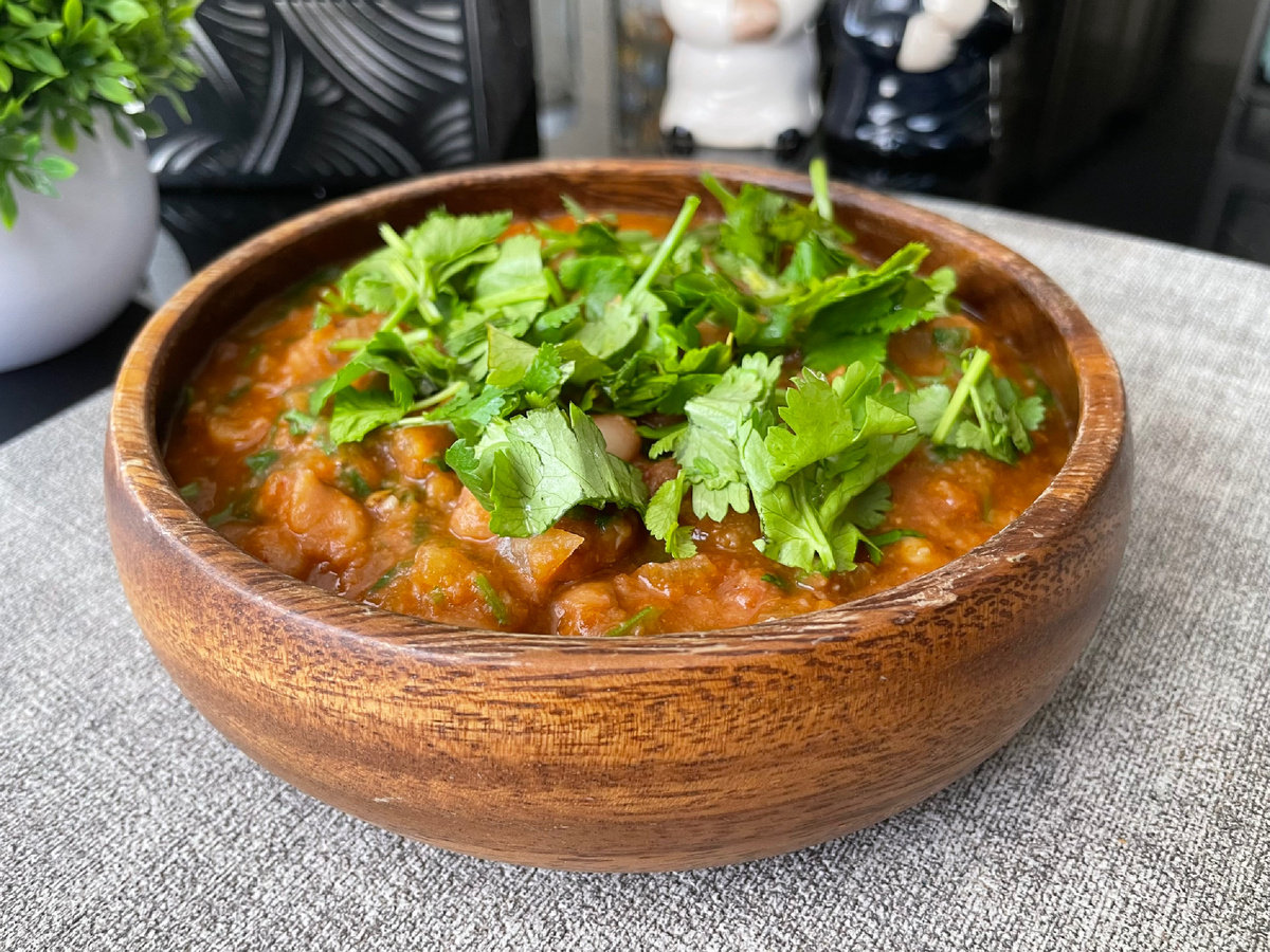 Попробовать блюдо на соль и добавить при необходимости. Часть фасоли (примерно 40%) переложить в чашу и пробить блендером.