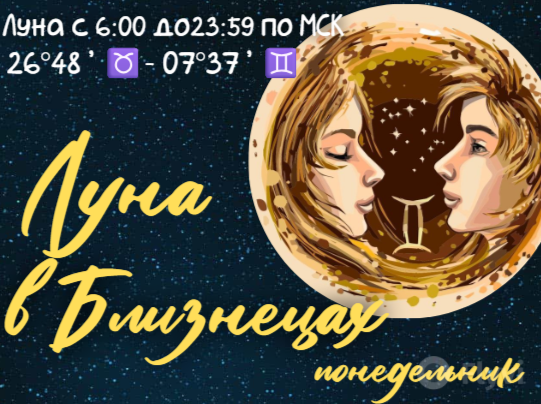 Понедельник — день Луны, день семьи, материнских энергий, домашнего уюта, хозяйственных дел, душевных бесед и морских прогулок. Луна в Близнецахь ♊ с 11:18 6-й лунный день Близнецовская Луна весьма общительна и переменчива. И чтобы не наделать ненужных дел — ведь Близнецы настроены на перемены, — лучше перенаправить эту энергию в нужное русло: можно отправиться на прогулку. И конечно, удовлетворить близнецовскую жажду знаний. Можно продолжать работу над старыми делами, потому что начатые в дни Близнецов проекты очень часто остаются незавершёнными. ☘️Рекомендуемые лечебные и профилактические процедуры на Луне в Близнецах — очищение крови и печени. В любом случае к вам могут прийти темы, созвучные энергиям Луны в Близнецах: 👍 недалёкие поездки; обращение в инстанции; оформление документов; обучение; поиск информации; интернет; покупка и чтение книг; покупка технических средств — компьютера, телефона, автомобиля; покупка обуви, спортивной и джинсовой одежды, духов; посещение технических