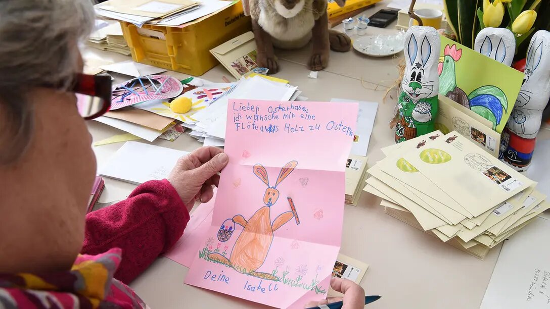 В пасхальном почтовом отделении в Остерайштедте (район Ротенбурга) волонтеры «Ханни Хазе» уже ответили на более чем 10 000 писем от детей. Очевидно, что желания детей изменились. К крайнему сроку приема писем 31 марта команда, работающая с талисманом «Ханни Хазе», ожидает десятки тысяч писем со всего мира, по словам директора Дорис Крёгер. Она отметила, что содержание писем значительно изменилось за последние годы. Если раньше дети часто отправляли списки желаемых игрушек, то теперь многие пишут о семье, дружбе или личных проблемах. Они также стали больше думать о других: пожелание мира выражается примерно в каждом втором письме. «Это полностью изменилось», — говорит Крёгер. «Ханни Хазе» — это контактное лицо для детей