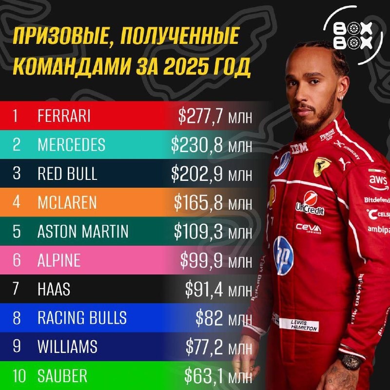 💰 Призовые выплаты командам Формулы-1 в 2025 году