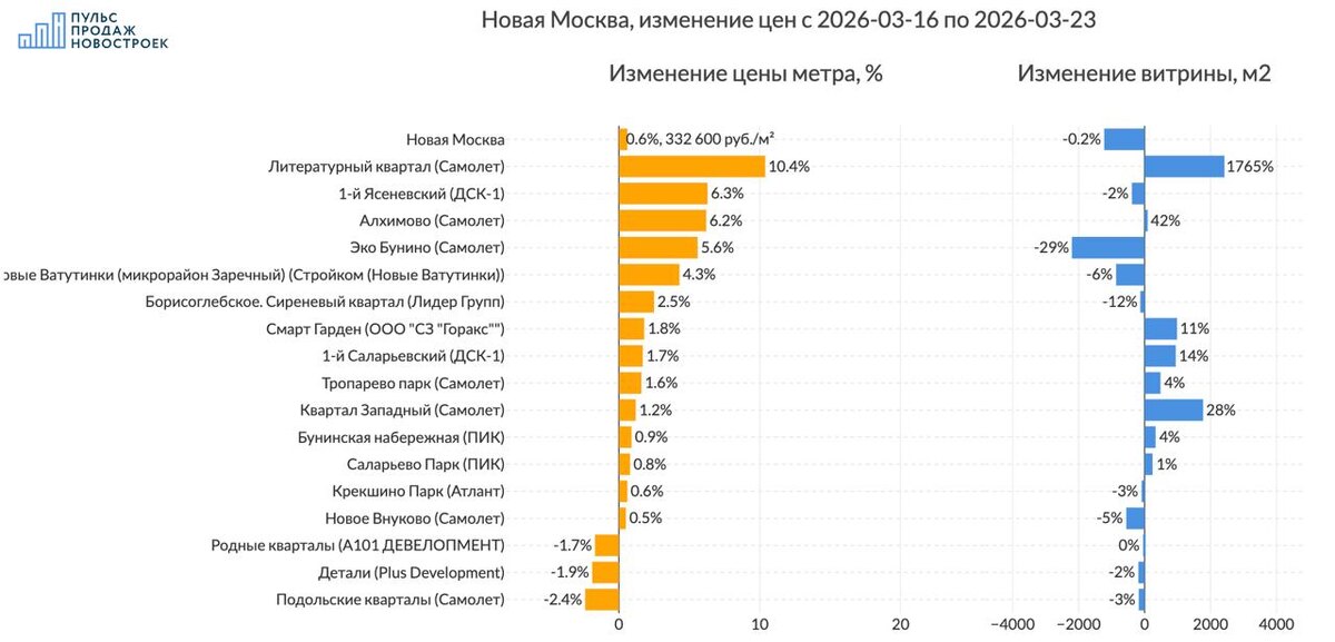 💰 Смотрим без премиум и элит классов. 💵 За 7 дней цена метра выросла на 0.6% до 332 600 рублей за метр. 📈Топ изменения цен (подорожало): 1️⃣ЖК "Литературный квартал" (Самолет) цена метра +10.4%, объем витрины при этом увеличился на 2418м2 2️⃣ЖК "1-й Ясеневский" (ДСК-1) цена метра +6.3%, витрина предложения уменьшилась на 382м2 3️⃣ЖК "Алхимово" (Самолет) цена метра +6.2%, объем витрины при этом увеличился на 93м2 🪫Анти топ (подешевело): 1️⃣ЖК "Подольские кварталы" (Самолет) -2.4% в цене, витрина предложения уменьшилась на 177м2 2️⃣ЖК "Детали" (Plus Development) -1.9% в цене, витрина предложения уменьшилась на 189м2 3️⃣ЖК "Родные кварталы" (А101 ДЕВЕЛОПМЕНТ) -1.7% в цене, витрина предложения уменьшилась на 35м2 ☄️Объем предложения жилья в регионе практически не изменился, всего -0.2%(-1225 м2) Все изменения в регионе на картинке. ‼️Только для наших подписчиков в телеграмм два сайта - сервис истории цен для поиска выгодных предложений и аналитики по проектам ПИК - рейтинг про