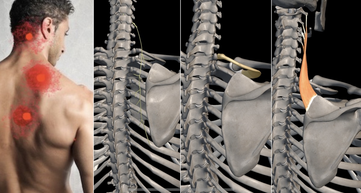 Теоретически, это опять та же мышца. Однако тут может быть вовлечен Тыльный нерв лопатки. Этот нерв выходит между 4 и 5 шейными позвонками. И если на его корешок «наступить» или передавить позвонками, то это даст раскатистую боль вертикально, почти от основания головы и ниже - вдоль лопатки.