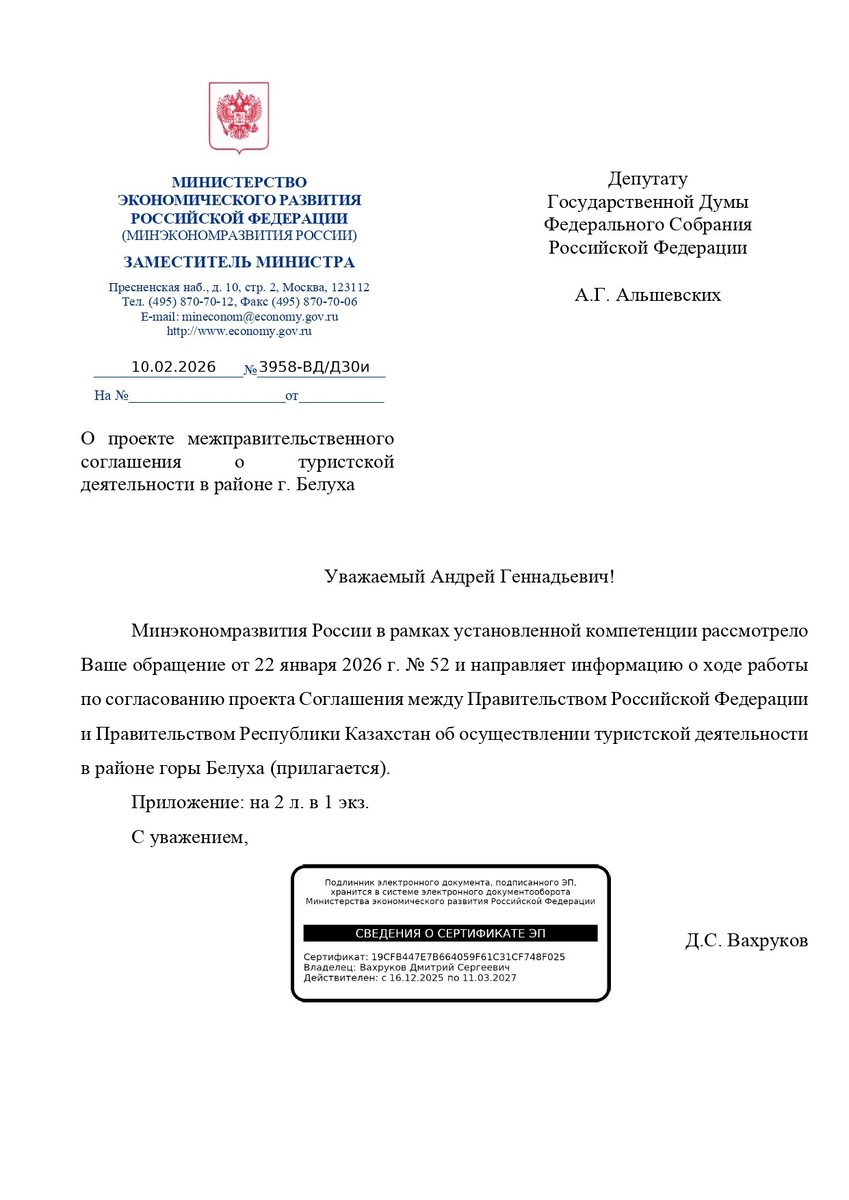 Гора расположена между Россией и Казахстаном, и дальнейшее развитие туризма в приграничной зоне требует официальных договоренностей между нашими странами. Время от времени интересуюсь у Минэкономразвития, как обстоят дела с согласованием соглашения.